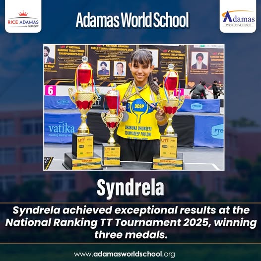 Adamas World School proudly celebrates Syndrela’s outstanding performance at the National Ranking TT Tournament 2025 held in Panchkula. Competing in three major events — U17 Girls Singles, U19 Girls Singles, and Women’s Singles — she displayed remarkable skill, determination, and consistency throughout the tournament.