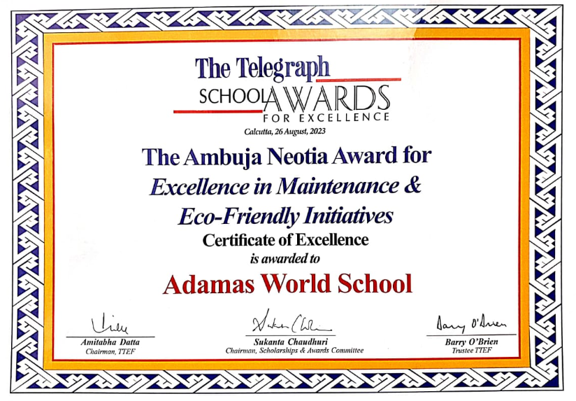 Adamas World School is overjoyed to announce that this year again we are the recipients of the Telegraph School Awards in the School category with the Certificate of Excellence in Maintenance & Eco-Friendly Initiatives.